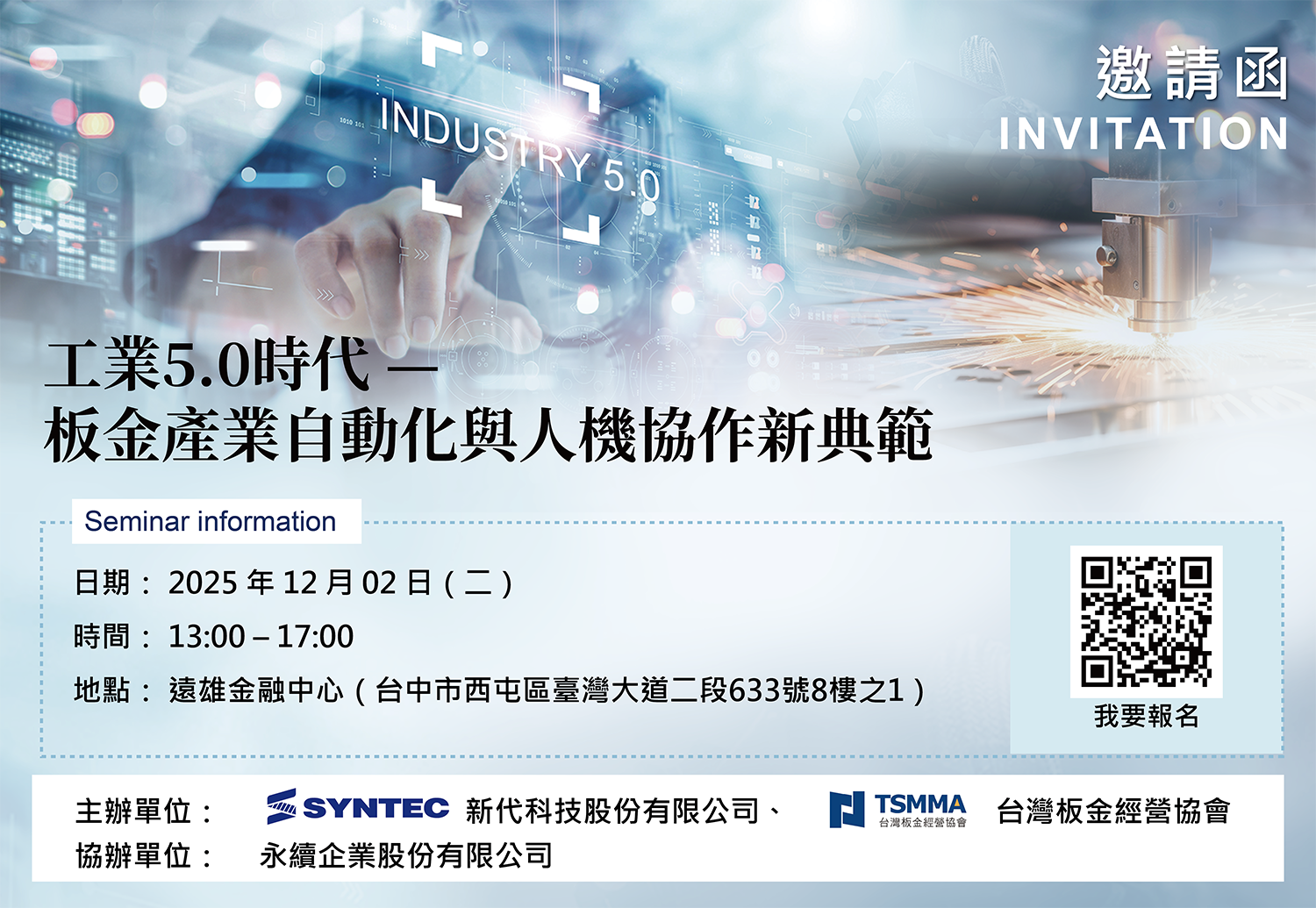 在此脈動下,新代科技與板金協會誠摯邀請您參加「工業5.0時代—板金產業自動化與人機協作新典範」研討會,攜手永續企業,共同探討如何以智慧控制、AI應用與自動化整合,形塑板金產業邁向高競爭力與永續發展的新典範。